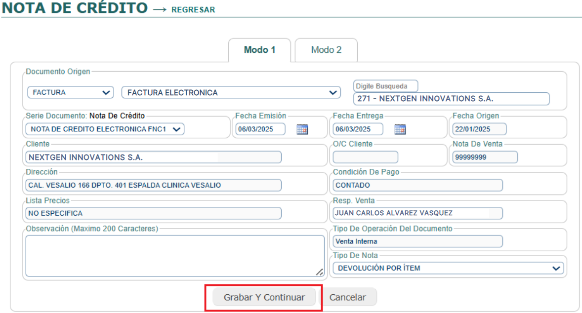 - Seleccionamos el tipo de nota Devolucion por item, luego hacemos clic en Grabar y Continuar.