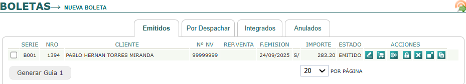 Muestra las boletas creadas, ya sea desde una Guía de Remisión o Nota de Venta. Acciones disponibles: