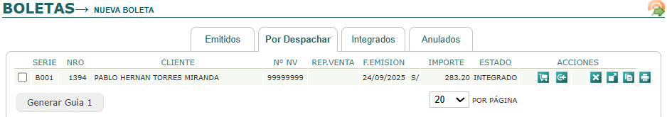 - Integrados : Boletas ya aceptadas por SUNAT. Cuenta con las acciones de Anular, Generar Guía Cerrada, Duplicar, Imprimir.