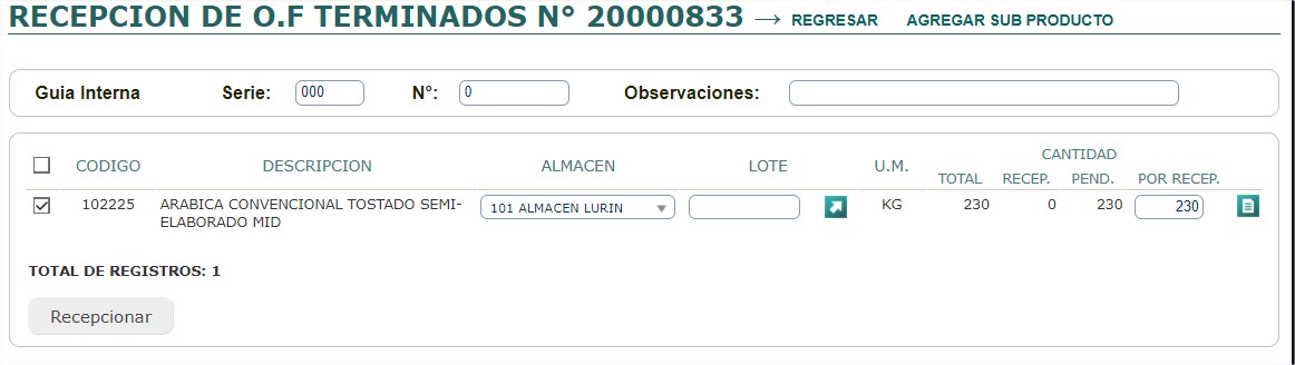 - Ingrese el Nro. Guía Interna, la serie, y la cantidad a recepcionar en la columna RECEP..