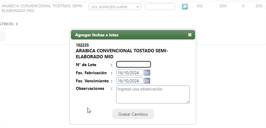 - Si el ítem o producto cuenta con fecha de vencimiento, haga clic en el ícono de la flecha(Ingresar Lote) para abrir la sección de información adicional.