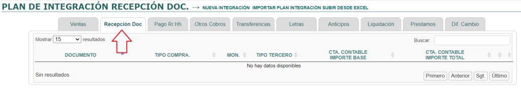 Contabilidad > Nueva Integración > Planes de Integración y seleccionamos la opción [RECEPCIÓN DOCS].
