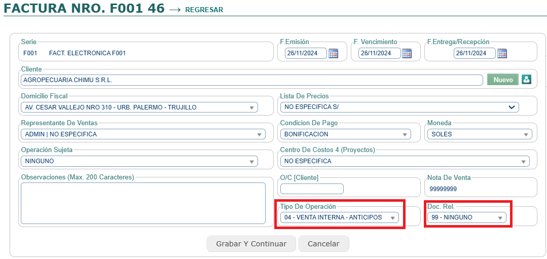 • Documento relacionado: elige “2-ANTICIPO”.